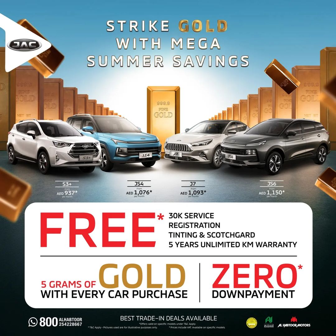 Al Habtoor Motors, the sole distributor of JAC Motors in the UAE, brings summer savings to all, offering great deals on its S3+, JS4, J7, and JS6 models starting from 1st May. On top of all the fantastic deals available, Al Habtoor Motors is giving five grams of gold with every vehicle purchase.