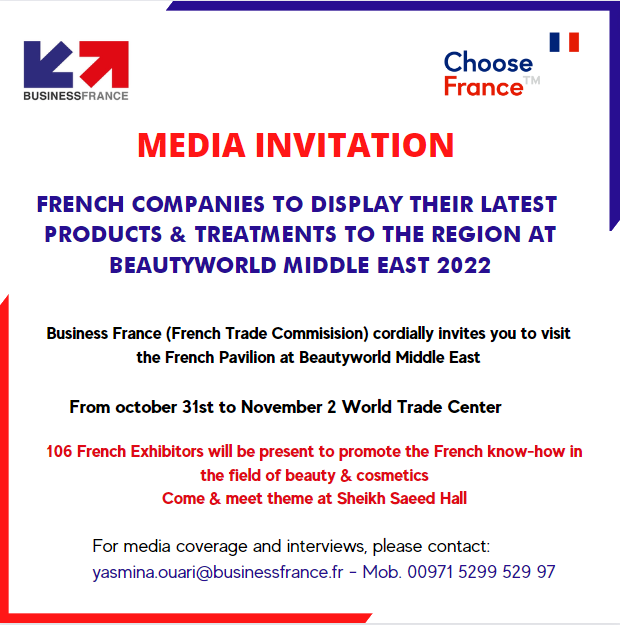 Axel Baroux, French Trade & Invest Commissioner & Managing Director of Business France Middle East, commented:” we are delighted to renew our commitment to participate at Beautyworld Middle East show. The France pavilion will be gathering a wide range of products and innovations showcasing the new trends in the cosmetic sector! professionals from the Near and Middle East will be able to get closer to the French companies specialised in different fields such as formulation of active ingredients, packing/packaging, to name just a few. This way, they will be able to take advantage of the expertise and quality of French ingredients and the high-technology equipment inherent in the French cosmetics and perfumery sector”