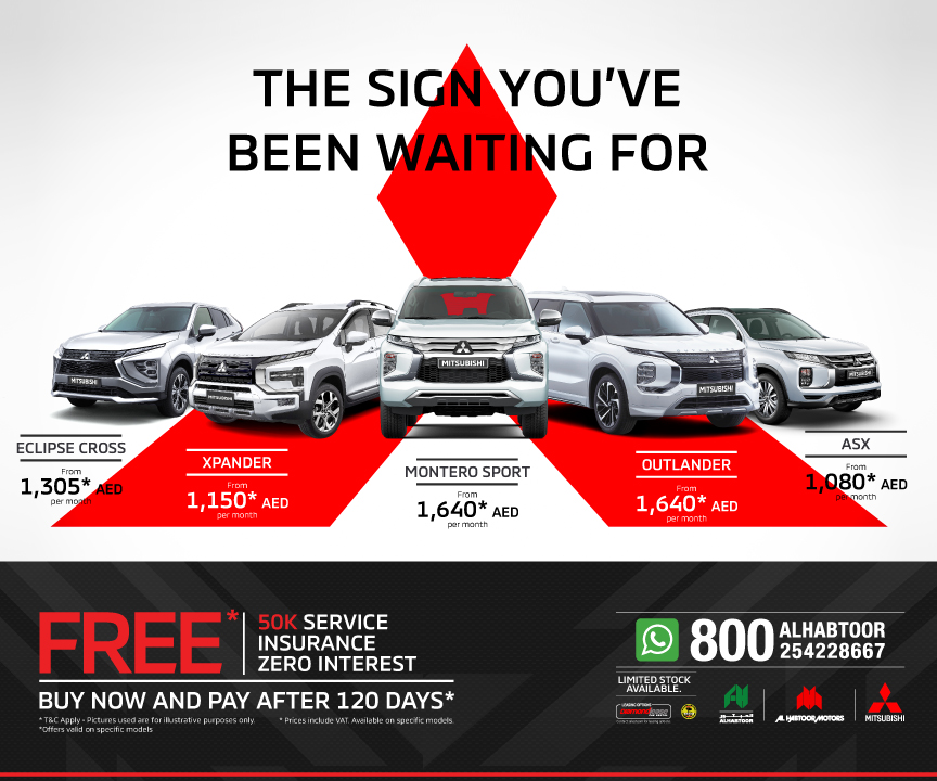 The car models eligible within this offer include: ASX, Eclipse Cross, Montero Sport, Outlander and Xpander. These SUVs are available from varying prices to be paid monthly within a lease with Al Habtoor Motors. The specific pricing models are as follows: the ASX model starting from AED 1,080 per month; the Xpander model starting from AED 1,150; the Eclipse Cross model starting from AED 1,305 and the Outlander and the Montero Sport starting from AED 1,640.