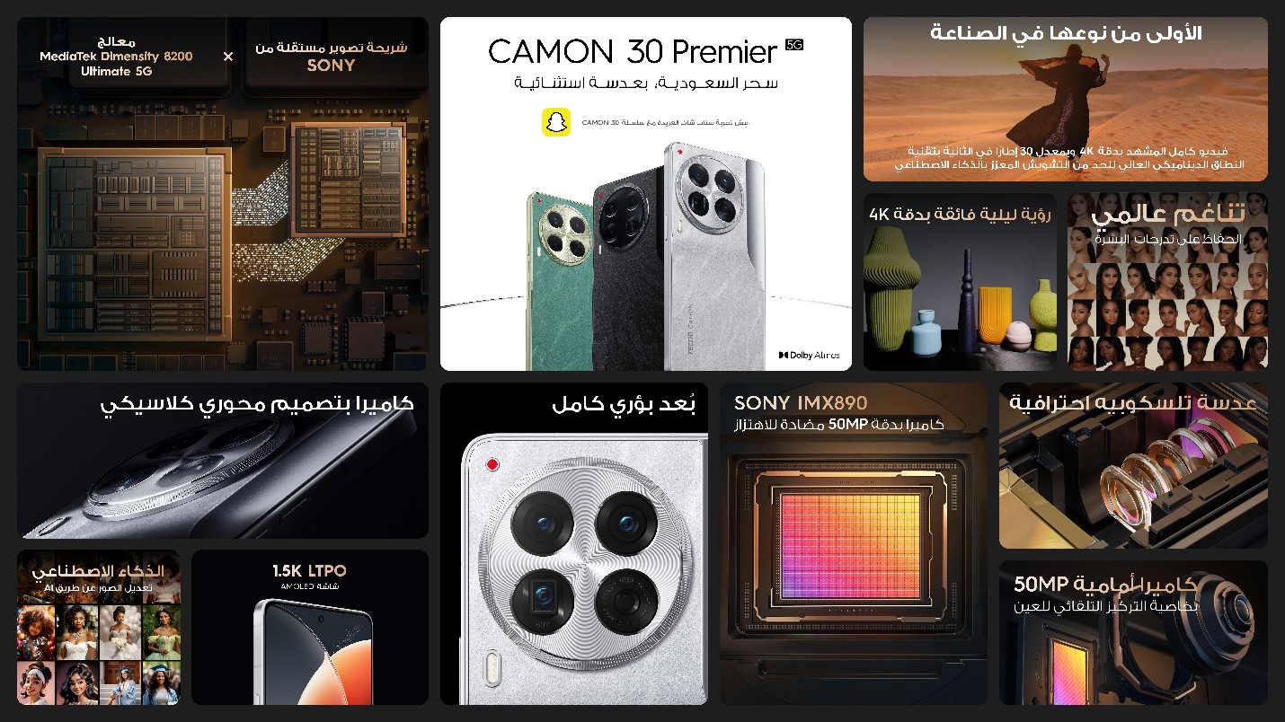 The CAMON 30 Series, initially launched globally in April 2024, is a flagship imaging smartphone that embodies TECNO’s CAMON design philosophy, offering modern users professional-level imaging capabilities with an exquisite, stylish aesthetic. The flagship model, CAMON 30 Premier 5G, delivers an incredible imaging upgrade with dual chips – including the Sony CXD5622GG Imaging Chip – and four 50MP lenses including a Sony IMX890 50MP OIS Main Camera for stunning photography. The Series takes a pioneering approach to AI, with a range of advanced AI functions elevating the user experience, while flagship power and performance further underscore TECNO’s relentless pursuit of innovation.