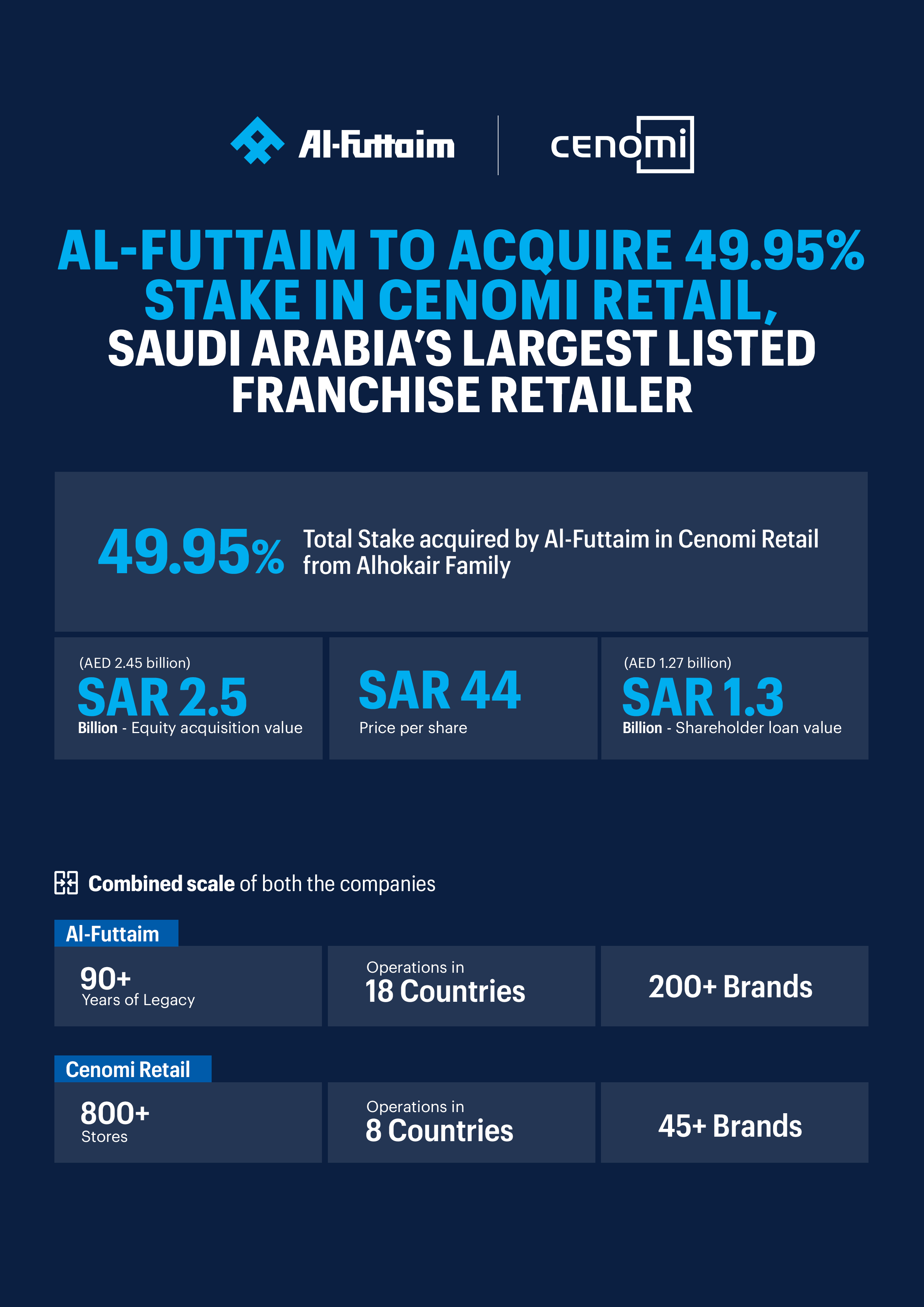Al-Futtaim enters into a Share Purchase Agreement (SPA) to acquire 49.95% of Cenomi Retail from its founding shareholders namely, Fawaz Abdulaziz Alhokair, Abdul Majeed Abdulaziz Alhokair, Salman Abdulaziz Alhokair, Saudi FAS Holding Company, and FAS Real Estate Company. Shares are priced at SAR 44 each, valuing the transaction at more than SAR 2.5 billion.