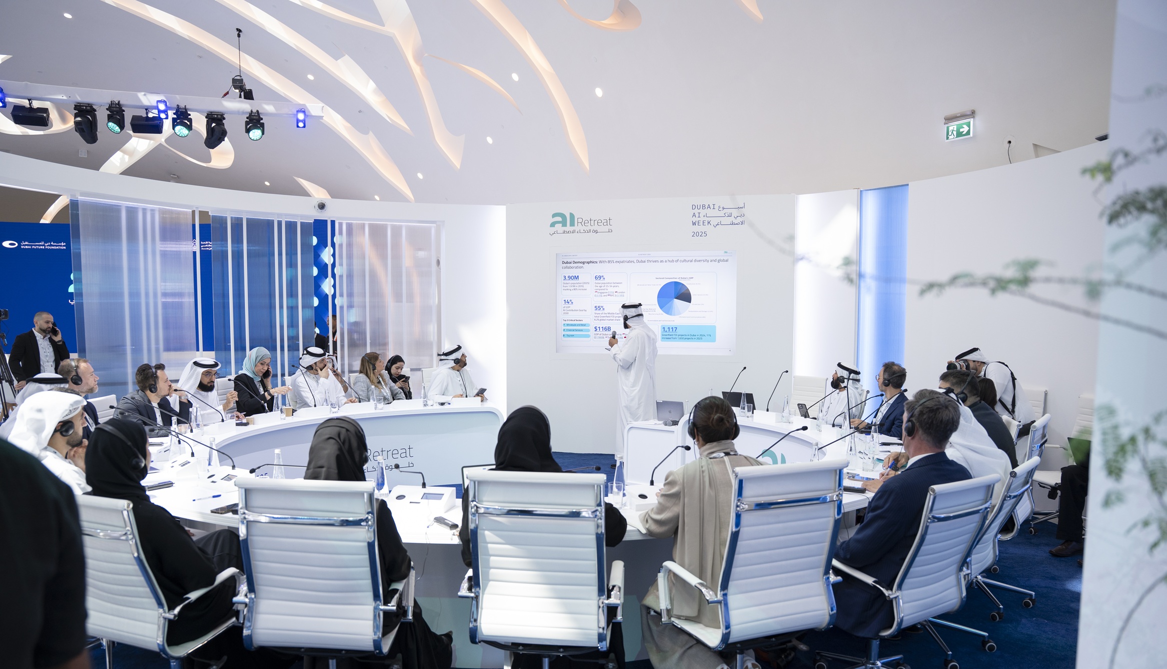 The Dubai AI Retreat also hosted a series of strategic roundtables. Under the theme “ Economy & Investment”, the first roundtable explored how AI can enhance Dubai’s economic competitiveness and attract foreign direct investment (FDI). Participants discussed strategies to boost productivity, foster AI entrepreneurship, and position Dubai as a global AI innovation hub, including ambitions to create 10 AI unicorns by 2030 across sectors such as logistics, fintech, and green energy. They also examined policy tools like tax incentives and agile regulations to support AI-driven FDI.