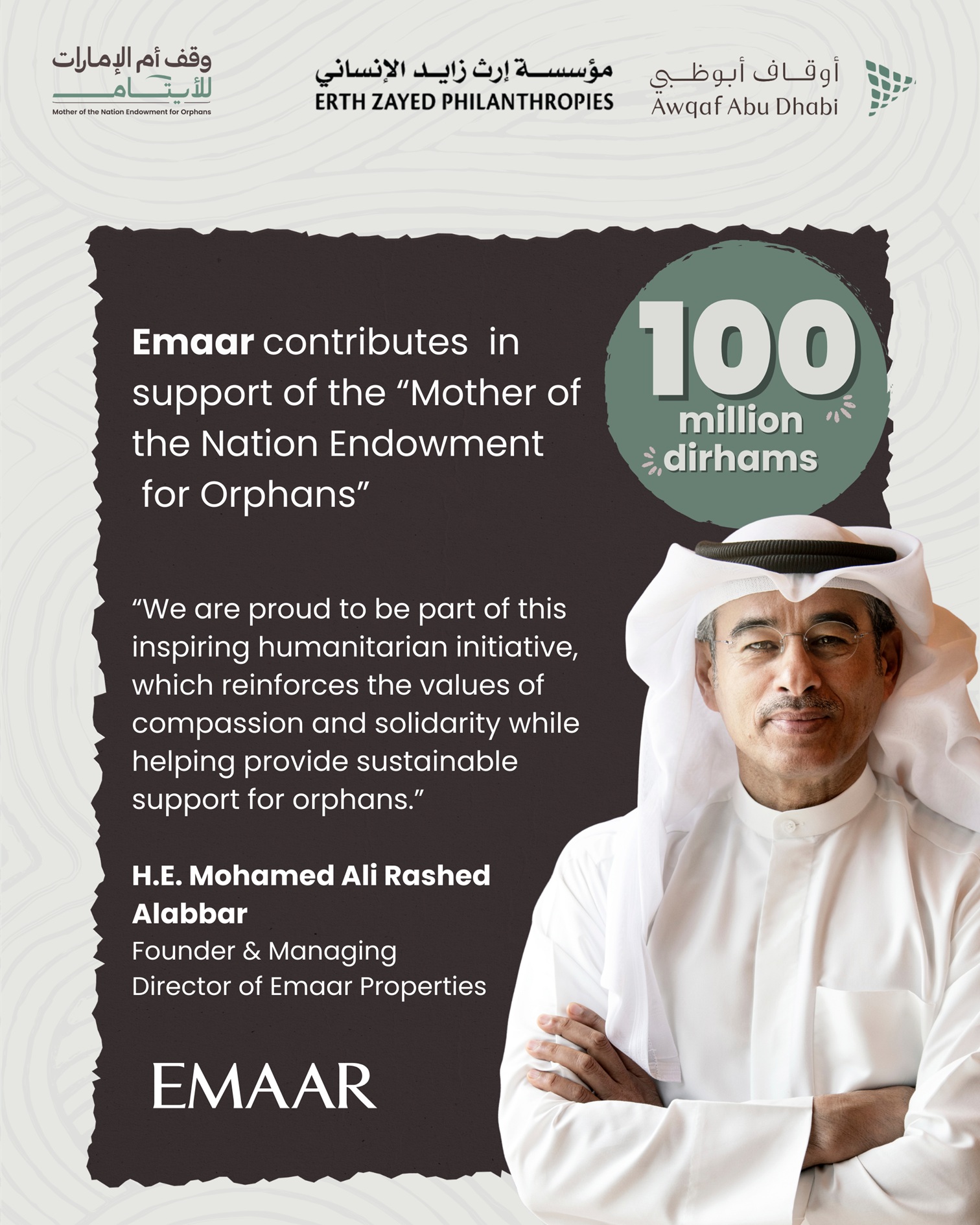 H.E. Mohamed Ali Rashed Alabbar, Founder & Managing Director of Emaar Properties said: “At Emaar, we believe that supporting national initiatives with sustainable humanitarian impact is a shared social responsibility. Our contribution to the ‘Mother of the Nation Endowment for Orphans’ campaign reflects our commitment to participating in initiatives that invest in people and support the most vulnerable groups in society. We are proud to be part of this inspiring humanitarian initiative, which reinforces the values of compassion and solidarity while helping provide sustainable support for orphans and ensuring a more stable future and better quality of life for them.”