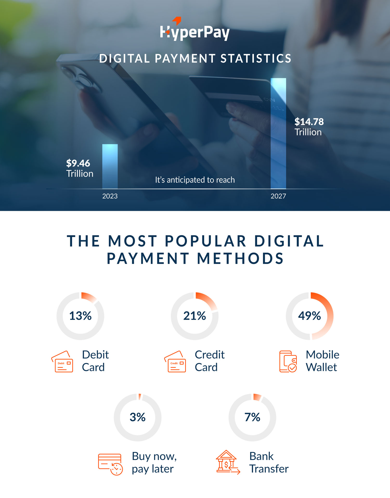 According to reports, in 2023, digital payment statistics were estimated at USD 9.46 trillion, and the market is anticipated to reach USD 14.78 trillion by 2027. In this regard, HyperPay’s key goal is to offer businesses the best payment gateway, payment solutions and payment services along with various other financial products to make payment processes easier, faster, and reliable.