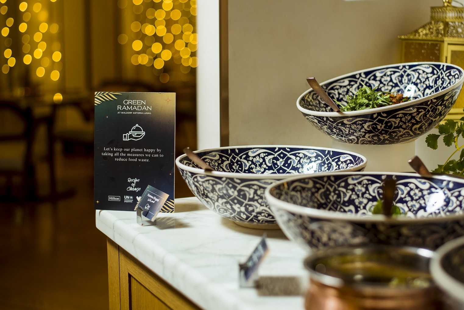 To measure, manage, and mitigate food waste across key markets in the Middle East, the Green Ramadan initiative was implemented in three of Hilton’s hotels: Waldorf Astoria Lusail Doha, Conrad Dubai, and Hilton Riyadh Hotel & Residences. The first week of the campaign served to create a data baseline, after which additional behavioural interventions were incorporated into the buffet and dining areas – including visual prompts and key messages from UNEP West Asia’s ‘Recipe of Change’ Sustainable Ramadan initiative.