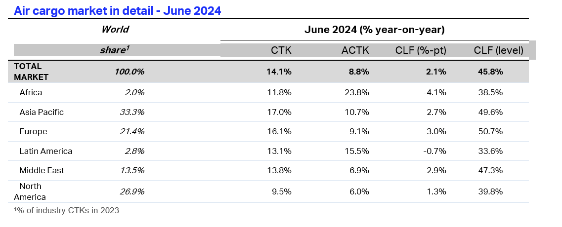 The International Air Transport Association (IATA) released data for June 2024 global air cargo markets showing continuing strong annual growth in demand. This contributed to an exceptional first half-year performance for air cargo, with volumes exceeding 2023, 2022, and even the record-breaking 2021 levels.