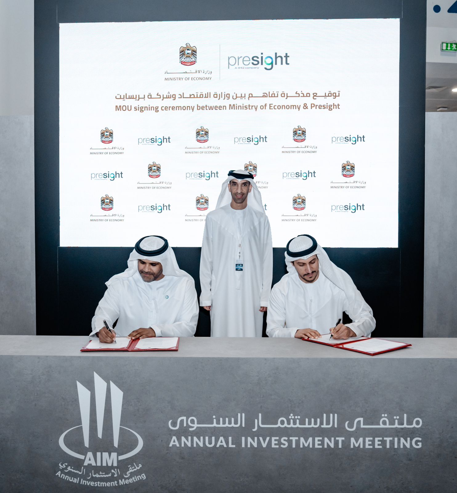 The MoU was signed by H.E. Juma Al Kait, Assistant Undersecretary of Foreign Trade at the Ministry of Economy and Dr. Adel Al Sharji, COO of Presight.