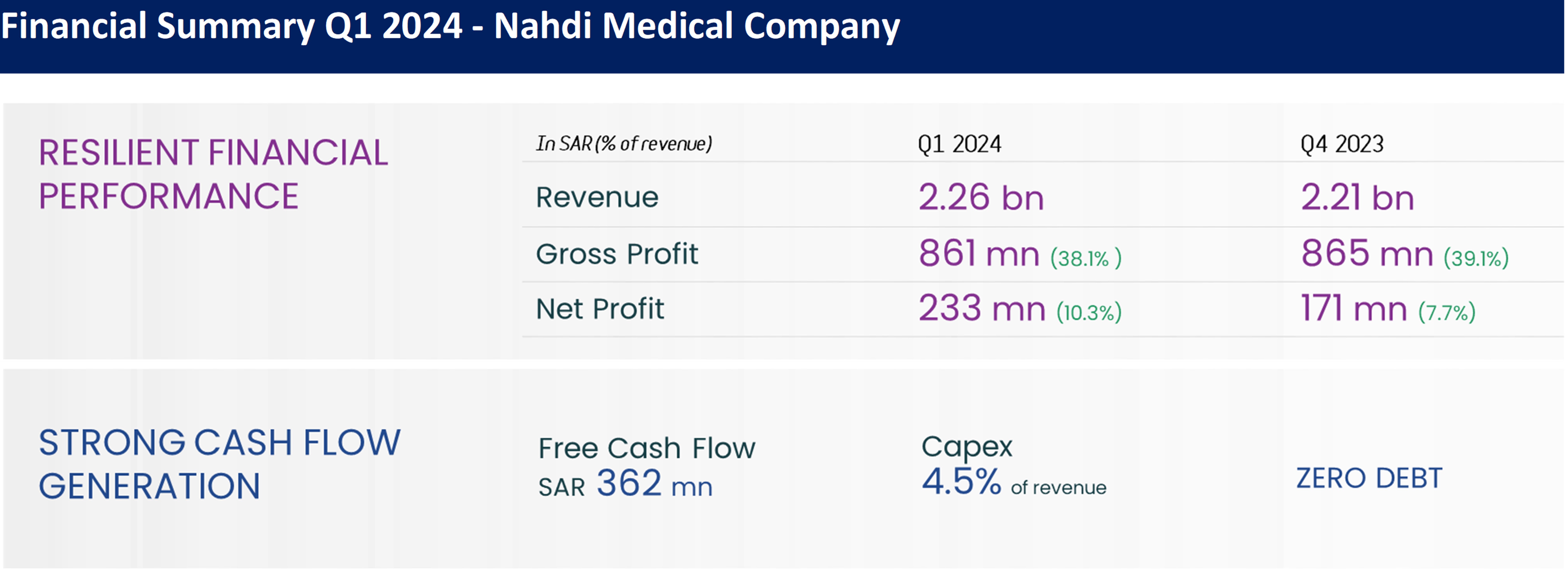 Exceeding its previous guidance, Nahdi Medical Company achieved SAR 2.26 billion in revenue in Q1 2024, representing a 7.2% increase compared to Q1 2023 and 2% increase compared to the previous quarter.