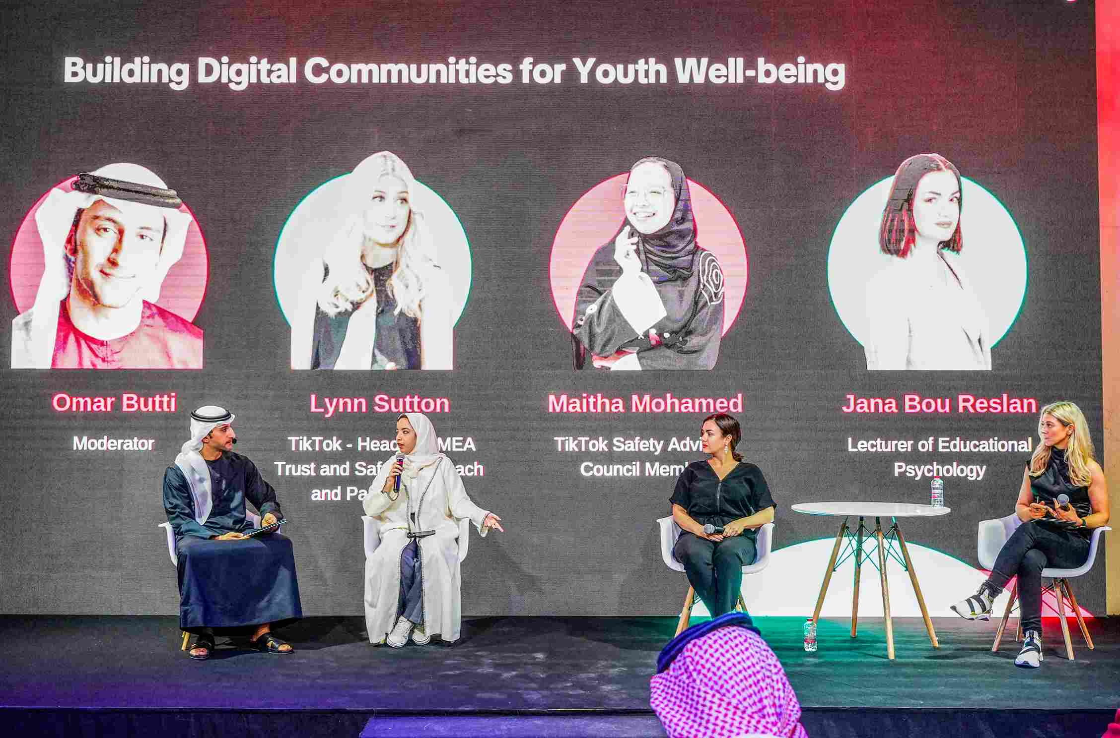 The second panel called “Building Digital Communities for Youth Well-being” welcomed Lynn Sutton along with TikTok’s Safety Advisory council member Maitha Mohamed and Lecturer of Educational Psychology, Trainer & Speaker on Leadership and Mental Health Jana Bou Reslan. They explored how digital communities cultivate compassion among users and highlighted the importance of constructive dialogues surrounding mental health, supported by robust content moderation processes, in establishing a nurturing environment for all.