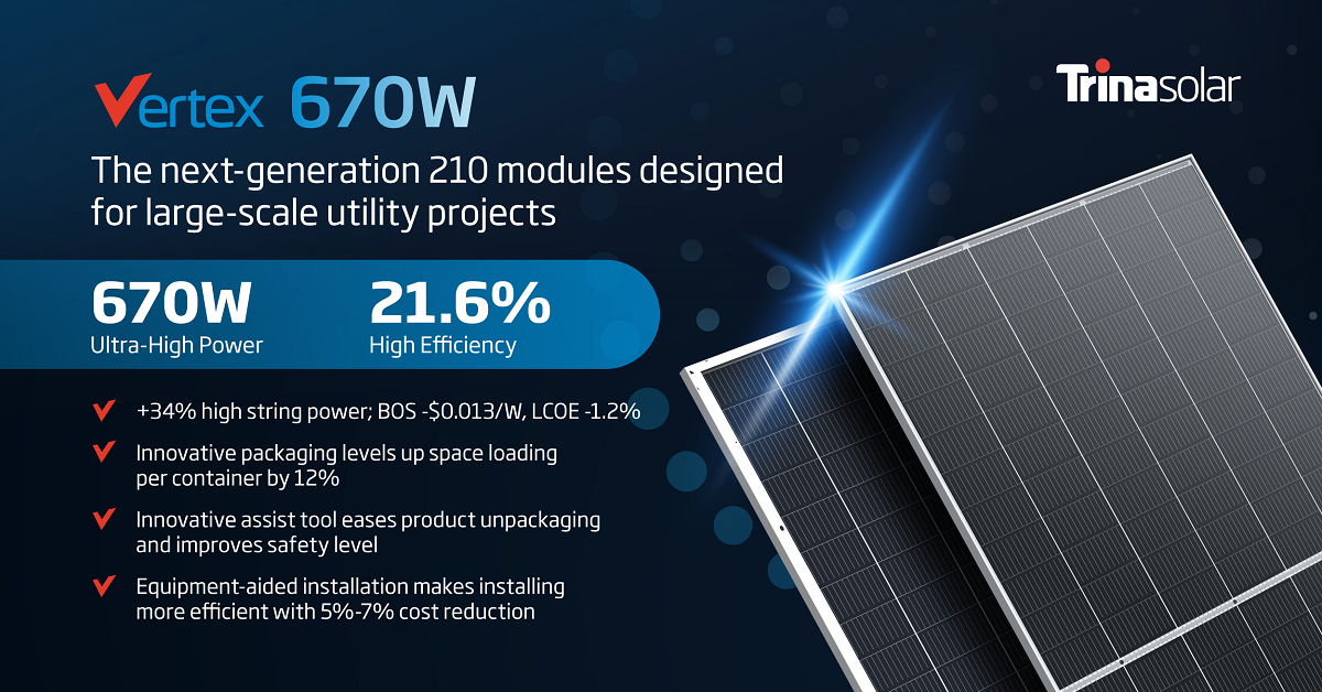 According to Dr. Zhang Yingbin, Trina Solar’s head of product strategy and marketing department, the 670W Vertex series inherits the non-destructive cutting, high-density interconnection and other high-precision technologies of the 210mm modules; with the ultra-high module power, the single string power gets 34% higher than that of other 500W+ modules in the industry. In addition, 670W Vertex modules maximize the container space utilization in transportation, as a result of which the 12% up in the loading power and 5 – 7% down in the installation cost, creating more room for reduction of the LCOE and BOS cost.
