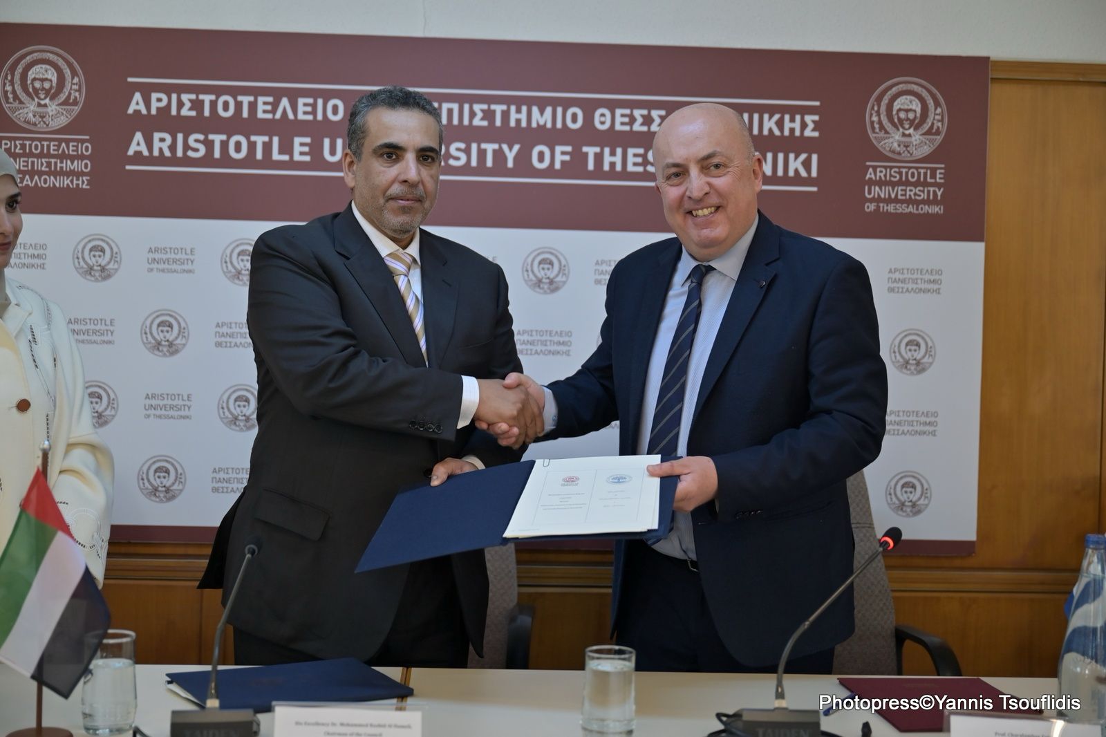 The Memorandum of Understanding was signed in the presence of His Excellency Dr. Mohamed Rashed Alhameli, chairman of the Board of Trustees of Mohamed Bin Zayed University for Humanities with Dr. Karima Matar Al Mazrouei, advisor to the chancellor of Mohamed Bin Zayed University for Humanities,signing on behalf of the university. Meanwhile, Professor Apostolos Apostolides, vice president, signed for Aristotle University.