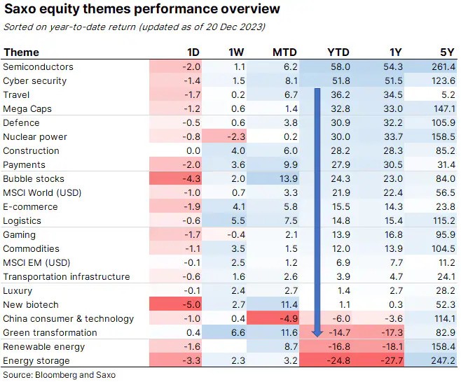 It was also a year that saw the green transformation gather momentum, especially in China where fuel demand looks set to peak next year. However, that focus did little to support capital intensive companies involved with the transition as they faced heavy selling pressure during the second half of the year amid lofty valuations coming under pressure from a rapid rise in the cost of money as interest rates and yields surged higher. Saxo’s equity themes highlight this weakness with green transformation, renewable energy and energy storage being the worst performing themes while the commodities theme is found near mid-table after returning around 12%.